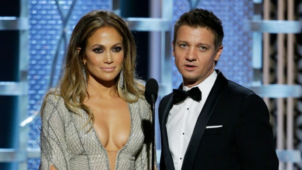 The 44-year-old actor took the stage Sunday with American Idol judge Jennifer Lopez, who turned heads on the red carpet in a low-cut Zuhair Murad gown, to present two awards. But before they revealed the winner for Best Actor in a TV, Mini-series or Movie, Renner snuck in a joke about J.Lo’s chest that had the Internet in a tizzy.