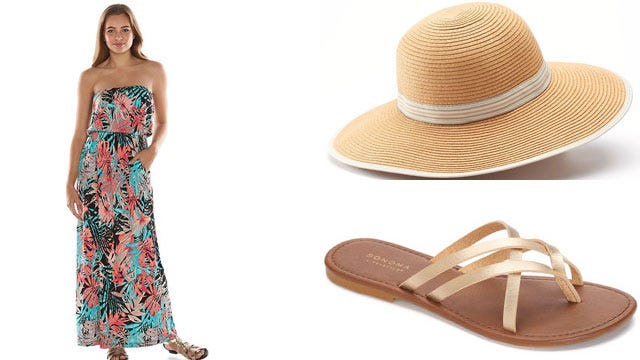 As we prepare to say goodbye to summer, we're getting our last beach days in while we still can. Here's how you can lounge in the sand with style. Kohl's has fantastic looks like this Trixxi Chevron Strapless Maxi Dress, Sonoma Life + Style Women's Criss-Cross Thong Flip Flops and an Apt. 9 Striped Ribbon Floppy Hat.
