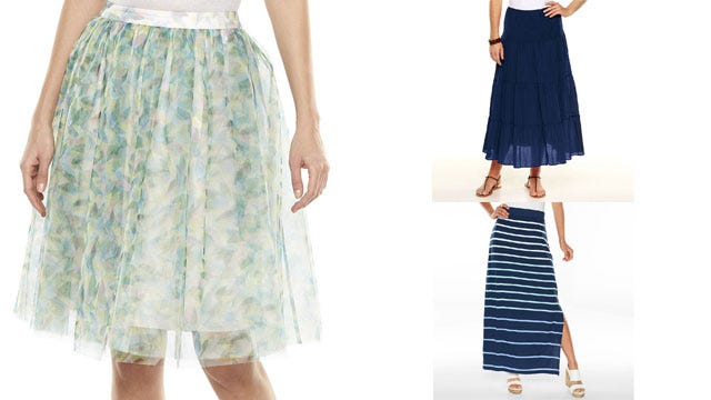 As spring heats up, so do the fashions. We found three cute skirts for work or play at Kohl's - Disney's Cinderella a Collection by LC Lauren Conrad Tulle Skirt (left), Chaps Tiered Gauze Maxi Skirt (top right) and Apt. 9 Maxi Skirt (bottom right).