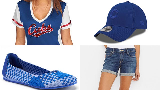 Baseball season is here, and we have some affordable looks for being cute and comfortable at the ballpark. Check out these items we found at Kohl's -- a Majestic Chicago Cubs Cooperstown Collection Curveball Babe Tee (top left), New Era Chicago Cubs Tone Tech Diamond Era 39Thirty Stretch-Fit Cap (top right), SO Women's Woven Ballet Flats (bottom left), Levi's Cuffed Jean Shorts (bottom right).
