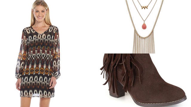 The '70s were a time of free love and peace movements and the hippie style from the sexy era is back. If you're looking to embody a chill persona, Kohl's has some of the best looks to choose from, like this shift dress, suede fringed booties and a fringe, bead and spike necklace set.