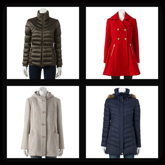 Click to purchase (clockwise from top left): Packable down puffer, Wool-blend peacoat, Hooded down puffer, Hooded tweed jacket.