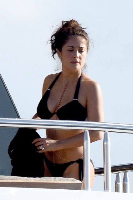 The actress and her husband, 52-year-old French billionaire Francois-Henri Pinault, enjoyed a day of yachting with their family and friends in St. Barts on Friday, where Salma showed off her killer curves in a black bikini. She also sported some eye-catching body jewelry going across her chest and stomach, reminiscent of Beyonce's favorite style.