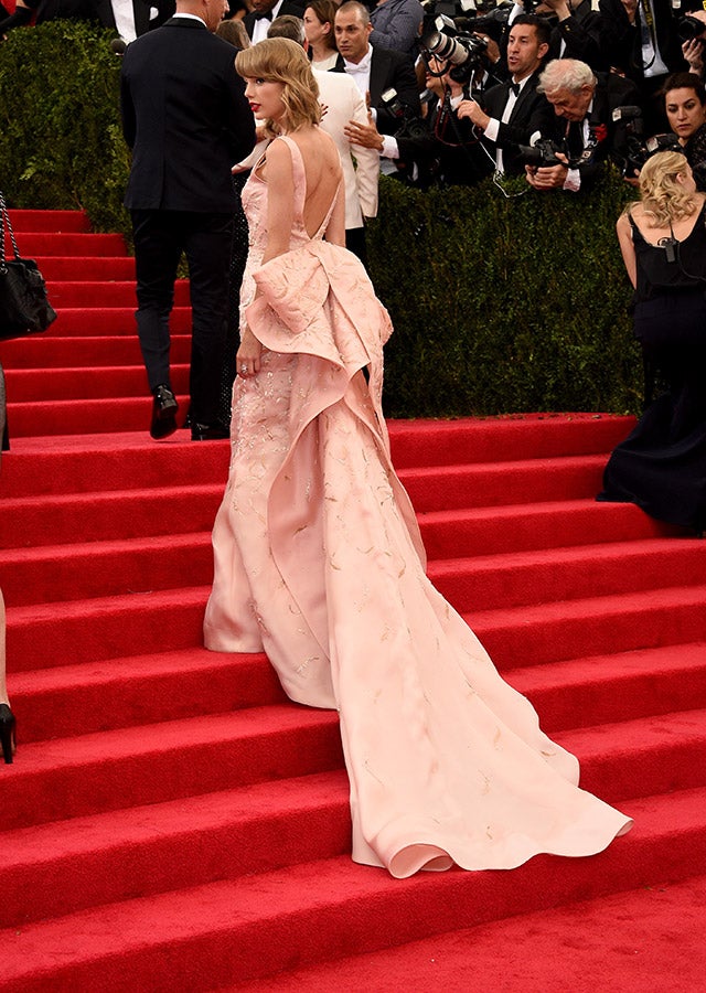 Swift returned to a girly princess aesthetic in a pretty pink Oscar de la Renta gown, which featured a bustle and a long train. The look nicely complemented 2014's theme, which celebrated classic couturier Charles James, and her flattering side-swept 'do and classic makeup was as flawless as ever.