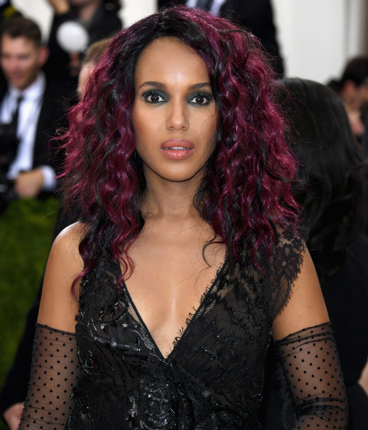Washington paired the gown with long, sheer, black Marc Jacobs gloves and black, Gianvito Rossi heels. However, the best complement to the ensemble was her dark, purple new hair style.