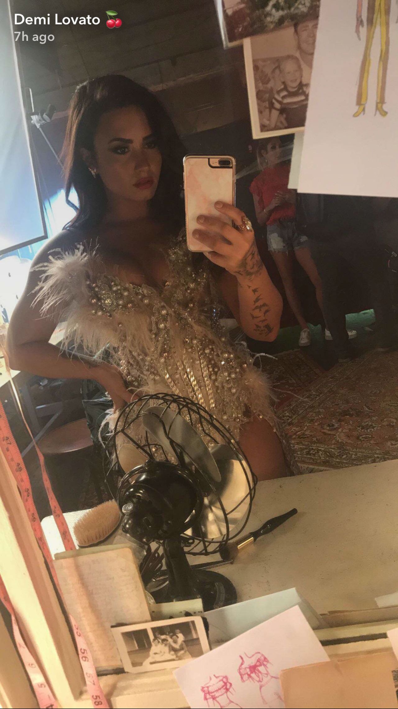 And what would a photo shoot be without some glitz and glam? The brunette beauty snapped picture No. 3 in the mirror to highlight the outfit's intricate sparkle and feather detailing.