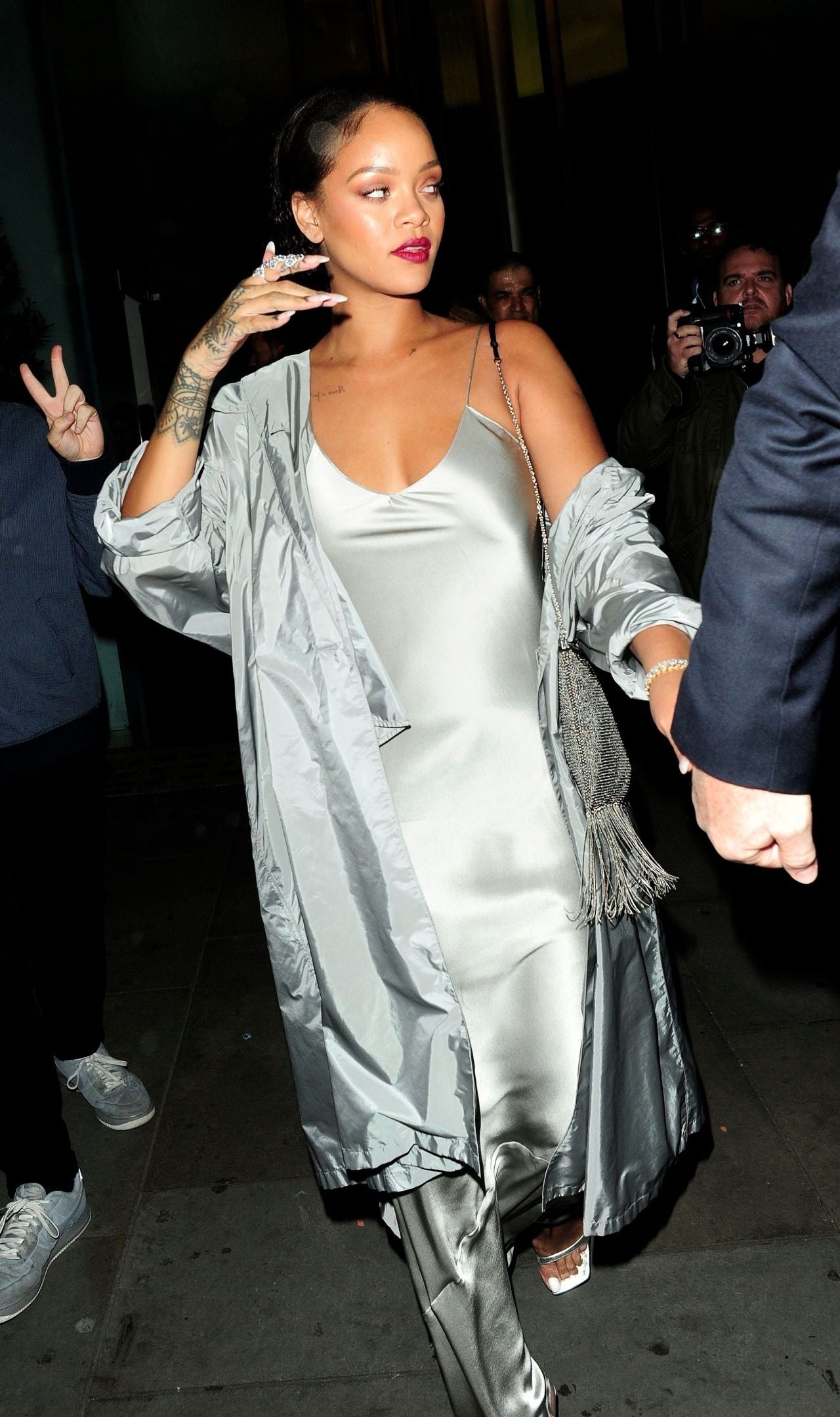 RiRi attended the film's official after party at the Chiltern Firehouse in London, England, on Monday, donning a stunning silver slip dress by Nili Lotan, which she paired with a matching Prada jacket and metallic Sergio Rossi sandals. She completed the look with silver jewels and a berry red pout.