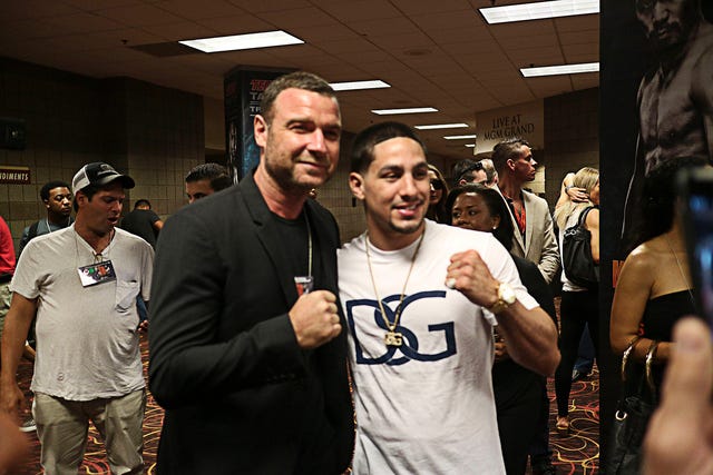 The Ray Donovan star chatted with boxer Danny "Swift" Garcia after the Mayweather and Pacquiao press conferences on May 1.