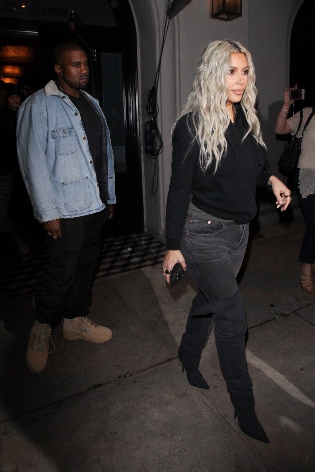 Kardashian, wearing a black sweatshirt, jeans and thigh-high boots, happily greeted fans and photographers while leaving the restaurant. West, sporting a denim jacket and black pants, meanwhile, looked a little less excited to see the paparazzi as he followed close behind his wife.