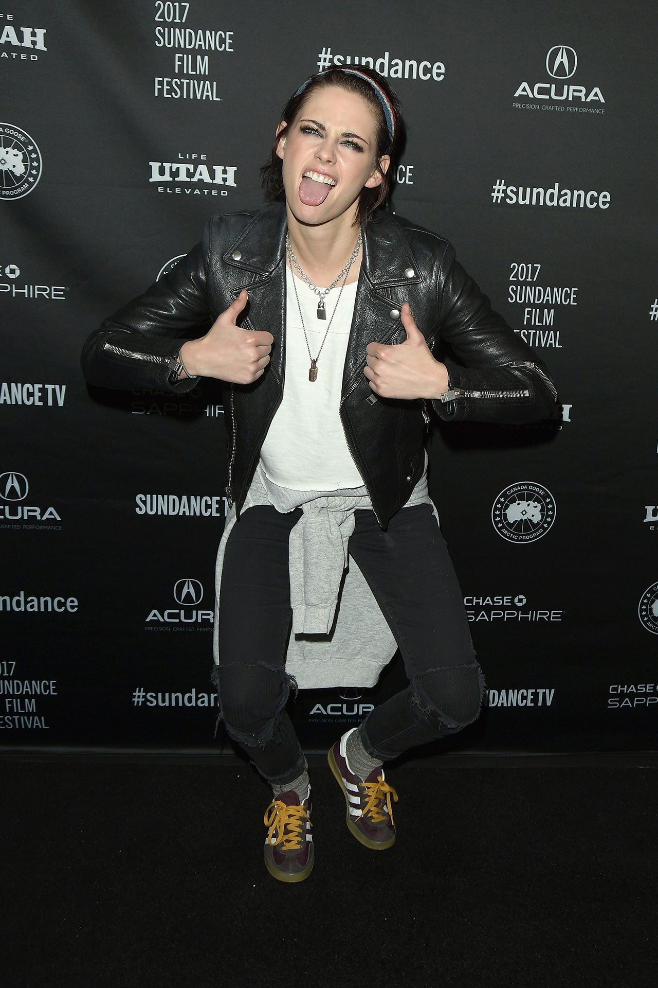Come Swim -- part of Refinery 29's Shatterbox Anthology highlighting female filmmakers -- debuted at the Sundance Film Festival on Thursday. A leather jacket-clad Stewart was uncharacteristically animated on the red carpet for the screening, giving the camera two thumbs up while sticking her tongue out.