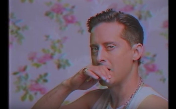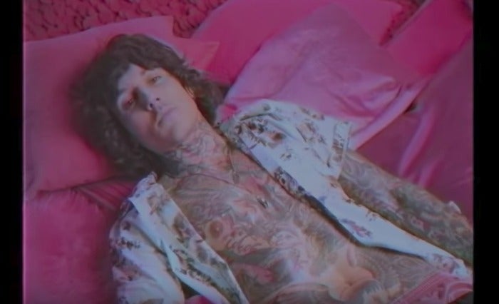6. Oli Sykes of Bring Me the Horizon lounges on pink pillows.