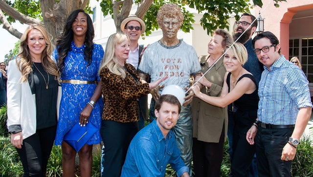 It’s been a decade, but we’d still vote for Pedro. Looks like Napoleon would too! In June, Jon Heder (the titular liger-tamer) and director Jared Hess were joined by castmates Hayley Duff, Shondrella Avery, Carmen Brady, Diedrich Bader, Sandy Martin, Tina Marjorino and Efren Ramirez (Pedro Sanchez) at L.A.’s Fox Studios. The motley crew from Preston, Idaho, were there to unveil a flippin’ sweet statue of Napoleon for the movie’s 10th anniversary.