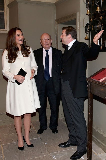 Kate, 33, looked ecstatic arriving at Ealing Studios in west London where the show is taped. Sporting a cream Jojo Maman Bebe babydoll coat and black heels, the eight-months pregnant Kate was greeted by writer and show creator Lord Julian Fellowes, before visiting make-up artists, costume designers as well as production, editorial and Ealing studios staff.