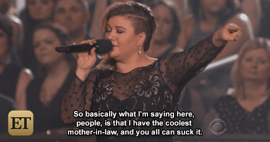 As the crowd cheered wildly, a giddy Kelly couldn't help but add, "So basically what I'm saying here, people, is that I have the coolest mother-in-law, and you all can suck it!"