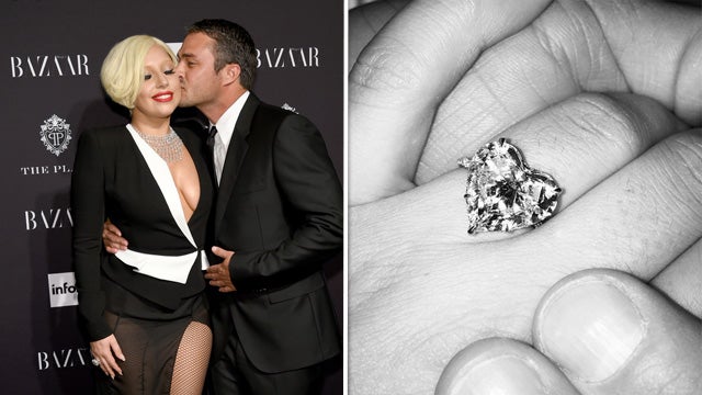 Earlier this year, Taylor Kinney proposed to the pop star with a massive heart-shaped diamond designed by Lorraine Schwartz. Shortly after the engagement, Lady Gaga posted a photo of the ring, estimated at 6-carats, on Instagram captioned, "He gave me his heart on Valentine's Day, and I said YES!"