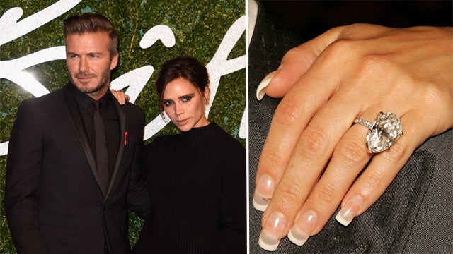 When David Beckham first proposed to the former Spice Girl in 1998, he did so with a modest (by celebrity standards) 3-carat marquise-cut diamond on a yellow band. Since then, Victoria has upgraded to a collection of 13 engagement rings from the soccer star, including a pear-shaped diamond that is estimated to be between 15- and 17-carats.