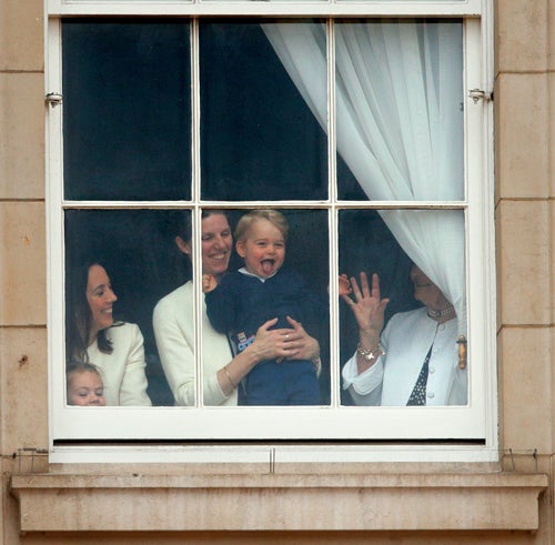 George was held up to the window to watch by his nannies and caretakers, as his father and mother, the Duke and Duchess of Cambridge were taking part in the ceremony, which is Queen Elizabeth II’s annual birthday parade.