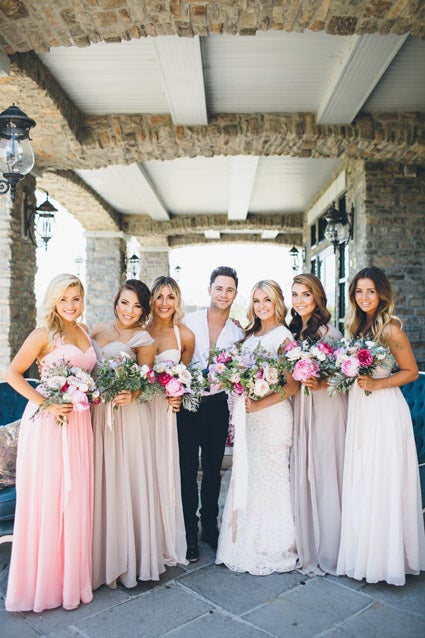 Arnold’s bridesmaids, who included DWTS pros Witney Carson, Emma Slater, Jenna Johnson, and Brittany Cherry as well as So You Think You Can Dance star Brooklyn Fullmer, wore dresses in varying shades of pink and creme, the wedding’s theme colors.