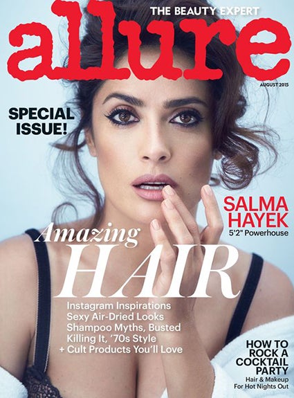 Salma Hayek stuns on the cover of Allure's August 2015 issue, showing off her famous curves in the accompanying photoshoot, which has the Frida actress going topless.