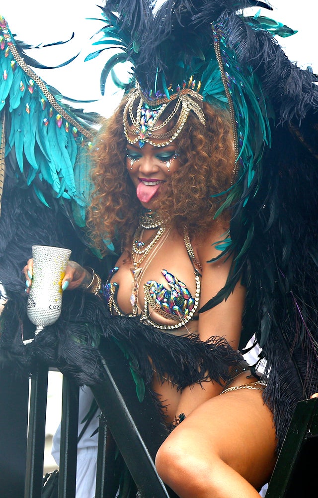 Rihanna donned a nearly naked zulu costume as she rode on a float in the Kadooment Day parade, a Carnival-like day of celebration in Barbados. Above, you can see Ri taking a selfie, and it’s no surprise wise. She looked sickening.