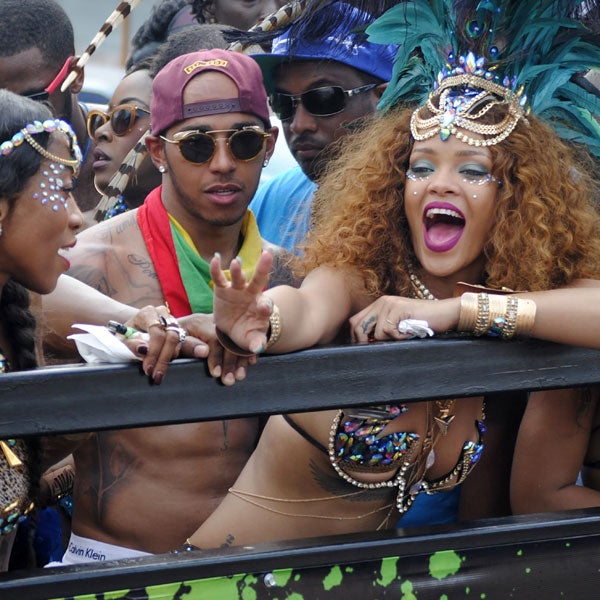 The 27-year-old singer was spotted partying and dancing with Nicole Scherzinger's ex-fiance, Lewis Hamilton, at the Crop Over's Kadooment Day Parade. The 30-year-old shirtless British race car driver celebrated wearing a backwards hat, trendy sunglasses and a colorful bandanna around his neck. Both his Calvin Klein underwear and his rock-hard abs were in full view.