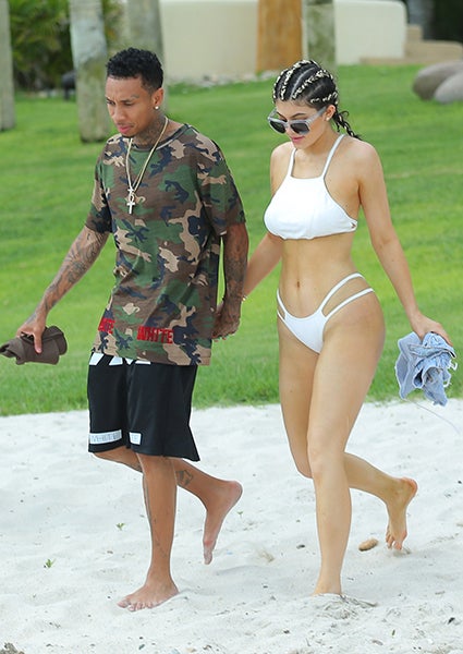 Given that Kylie's legal now -- she celebrated her 18th birthday on Monday -- we can only assume this is the start. Clad in a white two-piece bikini and rocking cornrows, Kylie clasped hands with the 25-year-old "Rack City" rapper on the beach.