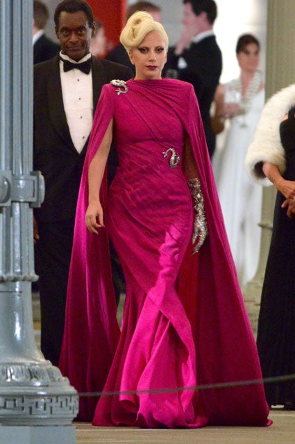 Gaga was snapped on set wearing a lavish magenta gown, complete with a floor-length cape and two jewel-encrusted serpent broaches. Her platinum locks were twisted into an elegant up-do, and her makeup featured a fierce cat-eye and dark fuchsia lipstick.