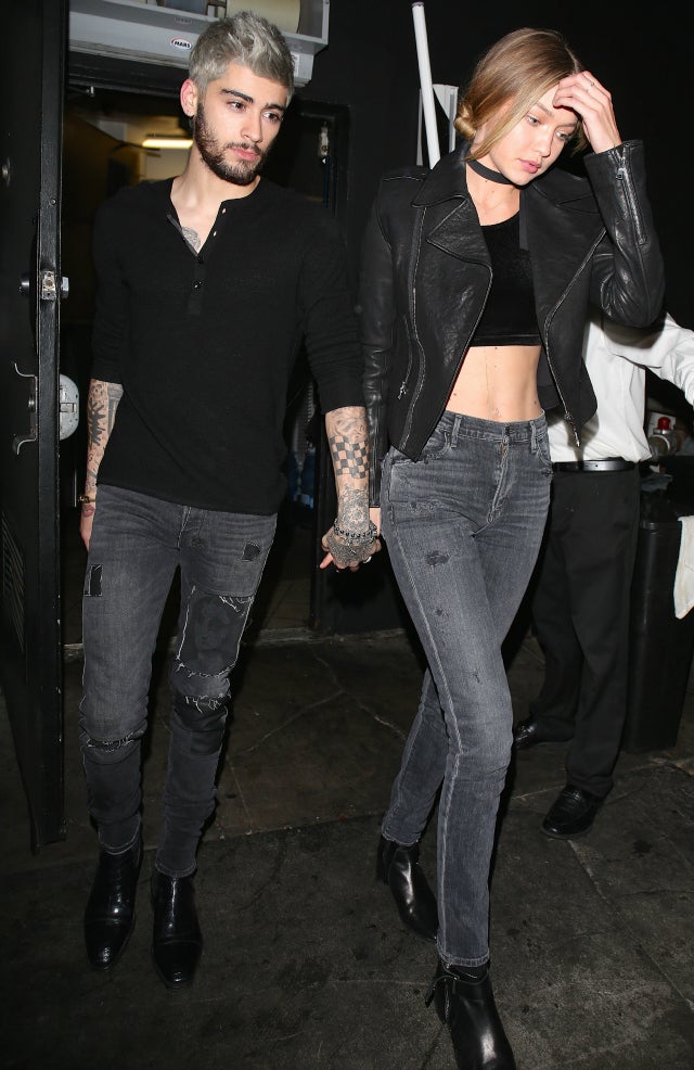 Malik rocked a black, long-sleeve V-neck shirt while Hadid showed off her toned figure in a black midriff top. The two reportedly left the restaurant together at 2:30 a.m., with their fingers interlocked.