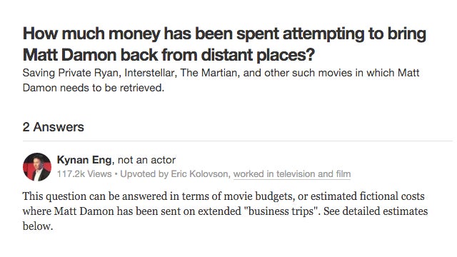 From Saving Private Ryan to The Martian, the Oscar winner’s movie characters are constantly getting left behind and/or otherwise needing to be saved. Now, an Australian researcher, Kynan Eng, has calculated how much it cost to keep the people Damon plays alive.