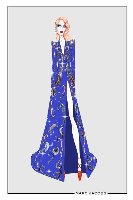 The "Born This Way" singer arrived for music's biggest night Monday night in a custom designed electric blue Marc Jacobs coat dress, bedazzled with a whole lotta sparkle and super glam bright orange hair. The dress is embroidered with multi-colored sequins and decorative metallic elements by Maison Lesage.