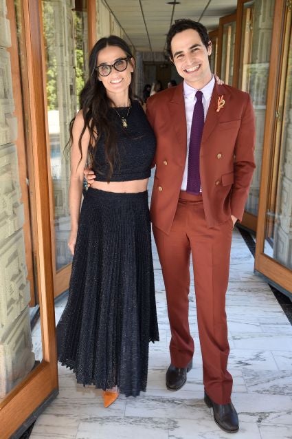 Moore stunned in a sparkly crop top, which she styled with a matching high-waisted pleated skirt, bright orange pointy-toe heels and black hipster glasses. The designer looked just as dapper, donning a burnt orange suit with a purple tie, as they posed for a photo together.