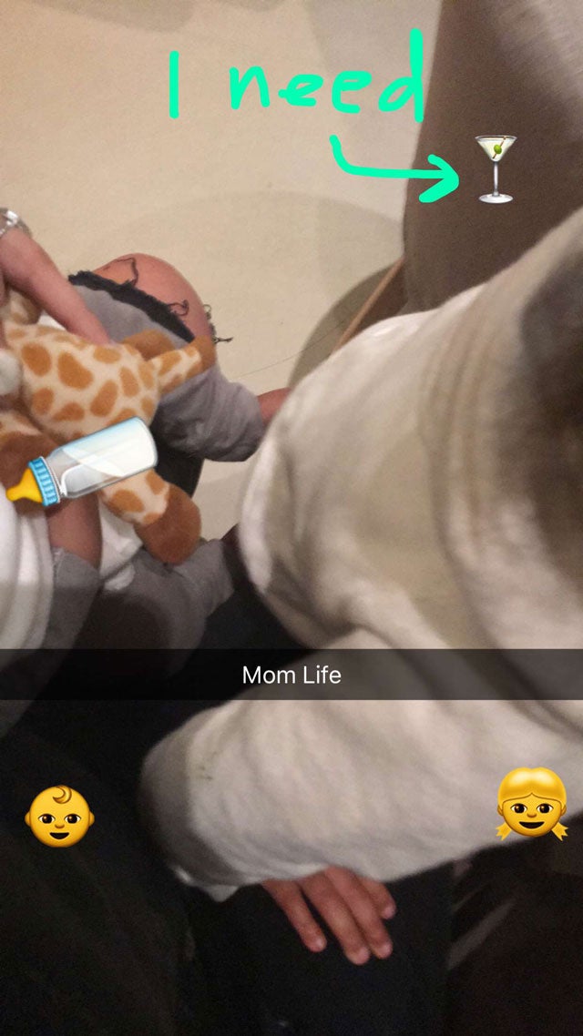 Kim, who joined Snapchat on Tuesday, also shared a photo of North and her 3-month-old son Saint, neither of whom are really visible in the image, sitting in her lap. Kim captioned the pic, "Mom Life," and also drew the words "I need" with an arrow pointing to a cocktail emoji.