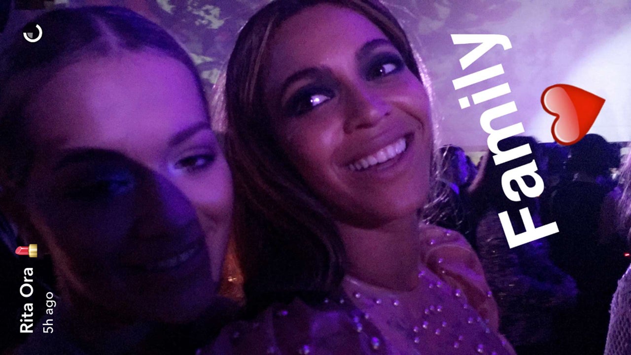 Ora switched out of her Vera Wang gown and into a scantily-clad, pleather mini-dress, but all eyes were still on her accessory. Later in the evening, the "Not Becky" pin -- which Katy Perry was also seen wearing -- was missing from her outfit, but a selfie of Ora and Beyonce showed up in the British pop star's Snapchat story. "Family," she captioned the pic of herself smiling with the Queen Bey.