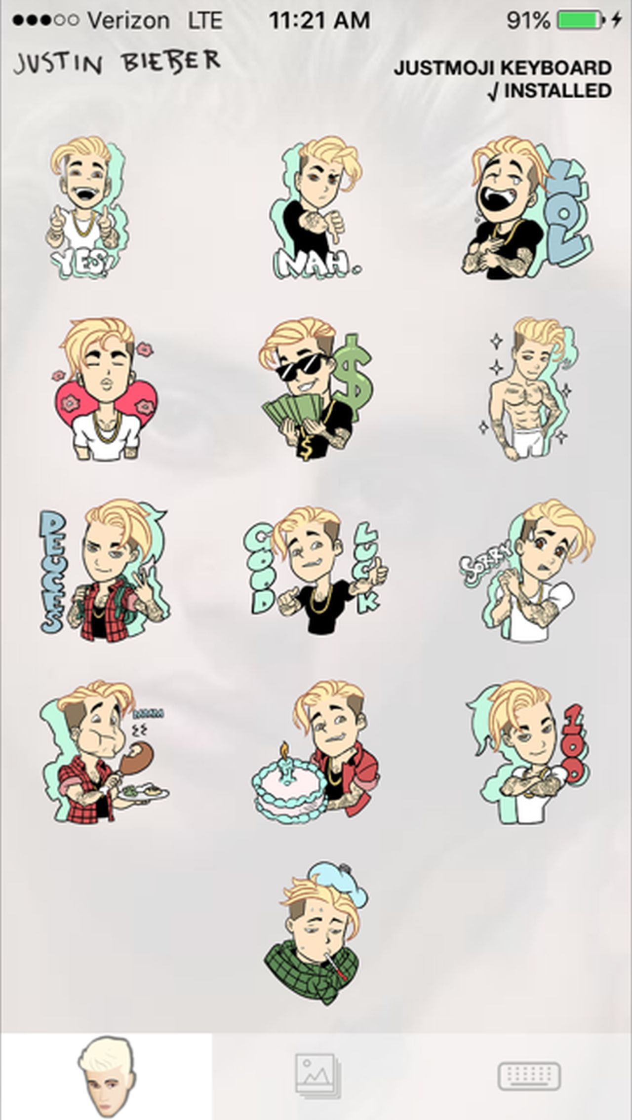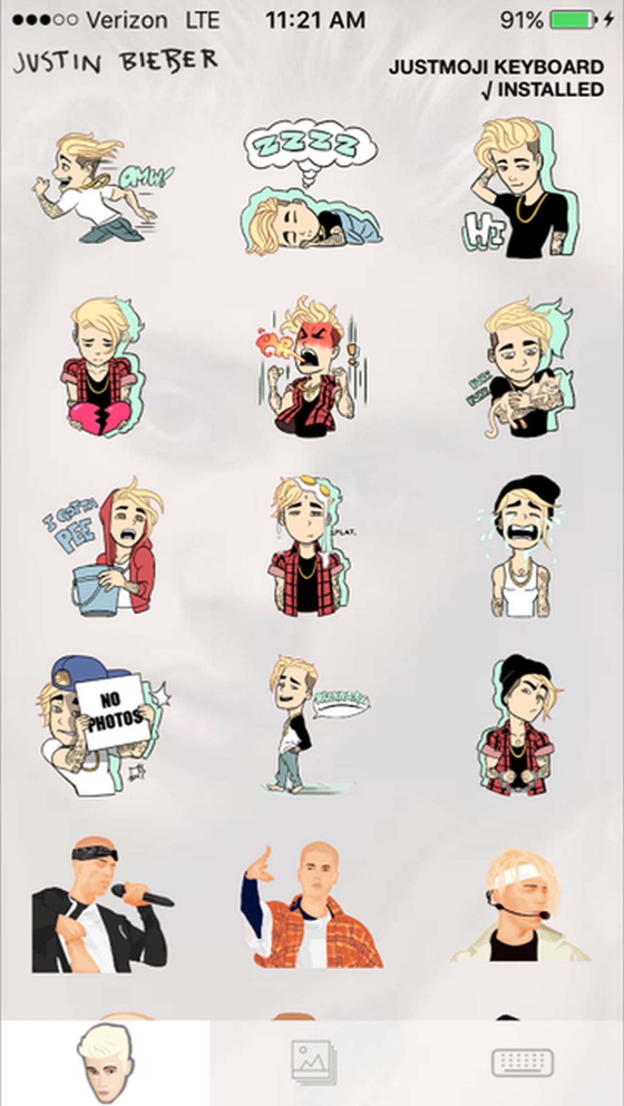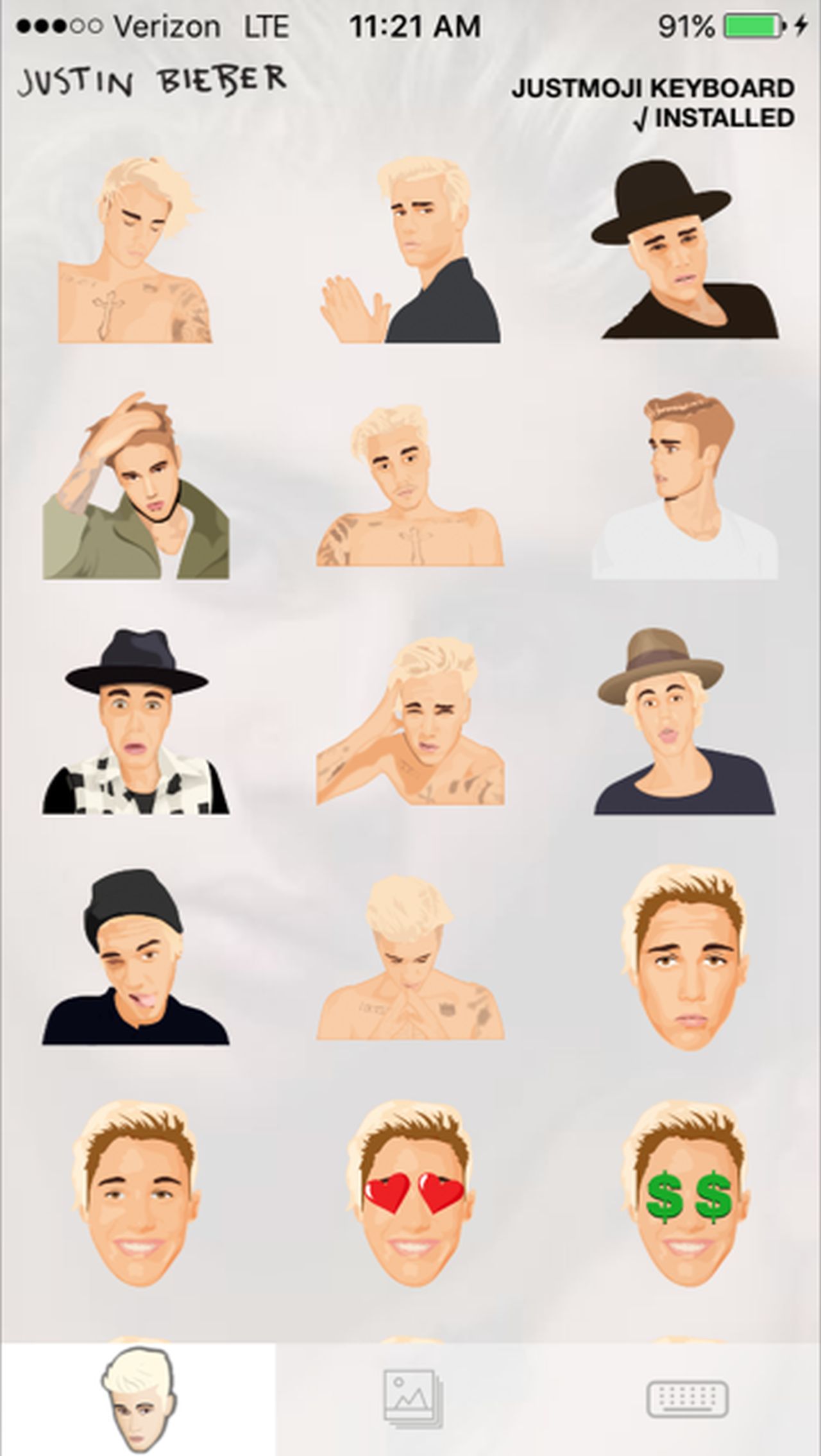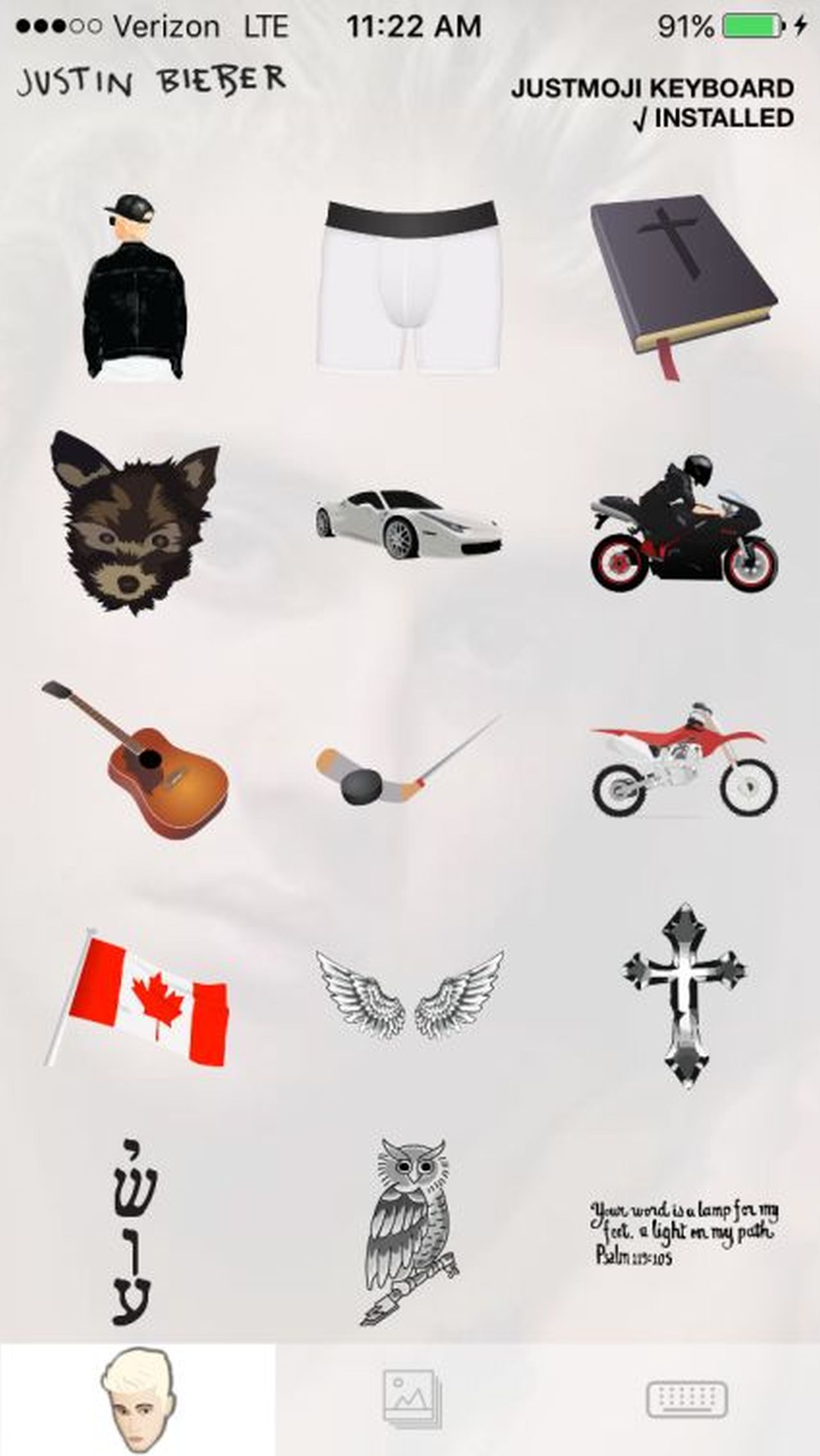 While most of the Justmojis include cartoon-like pics of the Biebs himself, the collection also includes stickers of his beloved Calvin Klein boxer briefs, a Canadian flag, guitar, hockey puck and his famous tattoos.