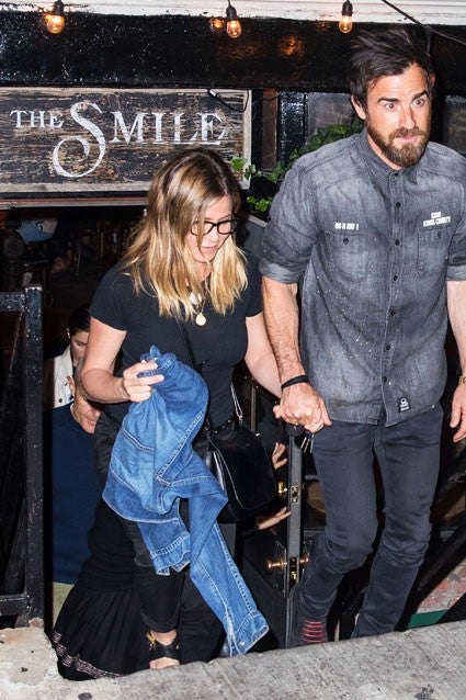 The Leftovers star held hands with his wife as they left the cozy restaurant, The Smile, and both Aniston, 46, and Theroux, 44, flashed their slight "smiles" upon exiting the eatery.