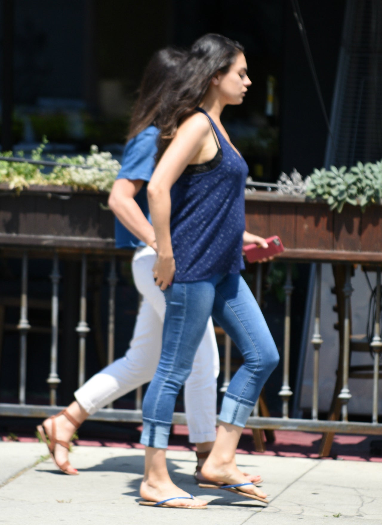 In rolled up jeans, flip flops and a loose, patterned, blue tank top, the 32-year-old Ted star’s burgeoning belly was clearly visible as she strolled down the street.