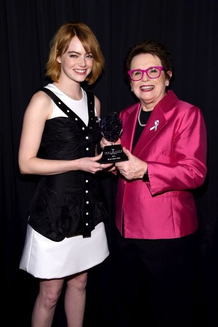 "When I began preparing for the role, Billie invited me to play some tennis," Stone told the crowd moments before presenting the Trailblazer Award to the 72-year-old former tennis pro. "Let me be clear about something, I was a complete novice -- at that point I'd had three lessons --and she, on the other hand, is one of the greatest players of all time. So, a fair match it was not."