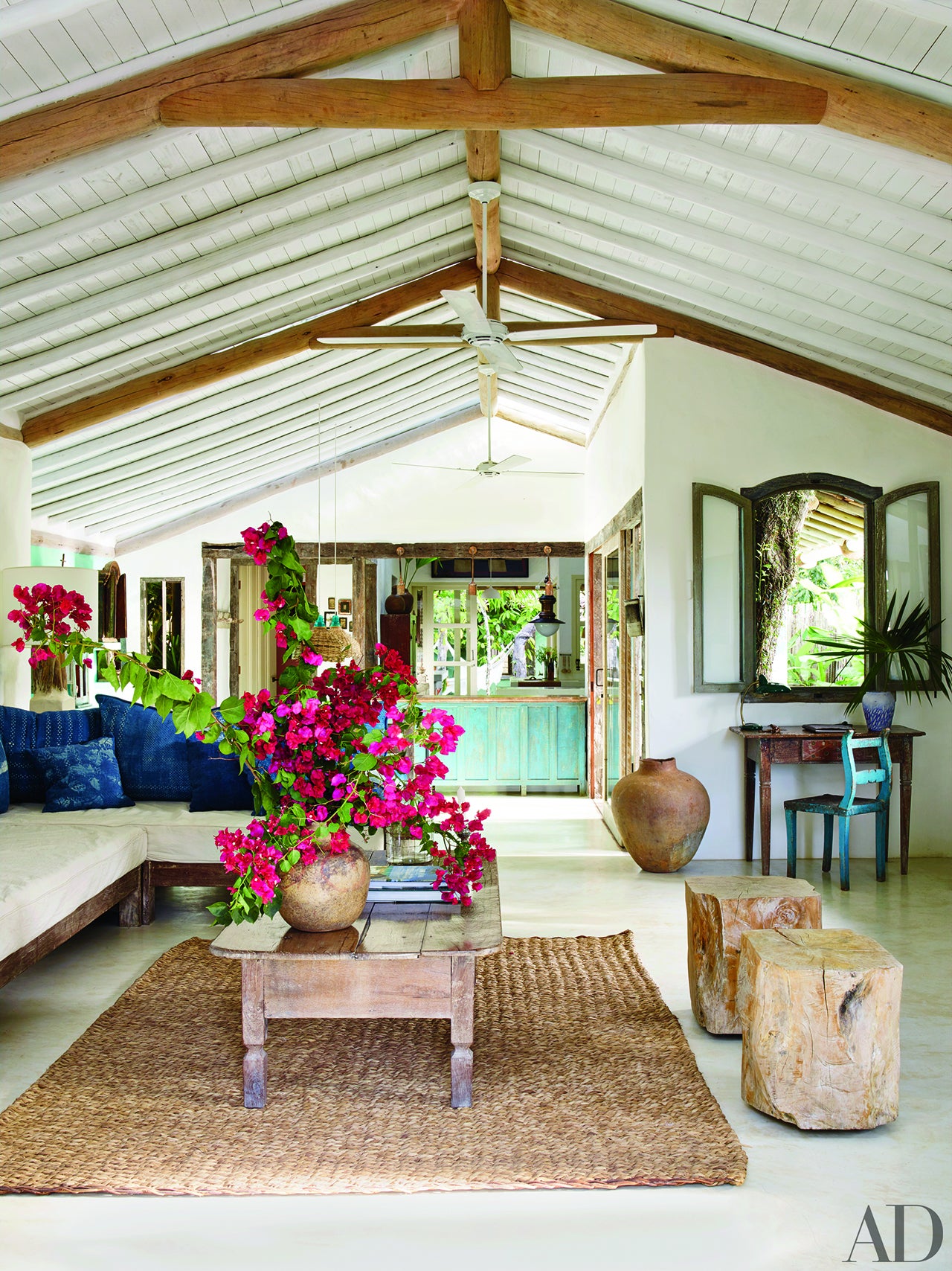 "The first cottage -- colonial in style -- contains the conjoined living and dining rooms, a kitchen, and a veranda for alfresco meals. The two center buildings are guest bungalows -- one of brick, the other built using pau a pique (or 'wattle and daub'), a process whereby clay is layered over a wood frame. The last structure, tucked away near the pool, is a two-story tree house of reclaimed timber planks that comprises a master suite above and an outdoor living room and bar below."