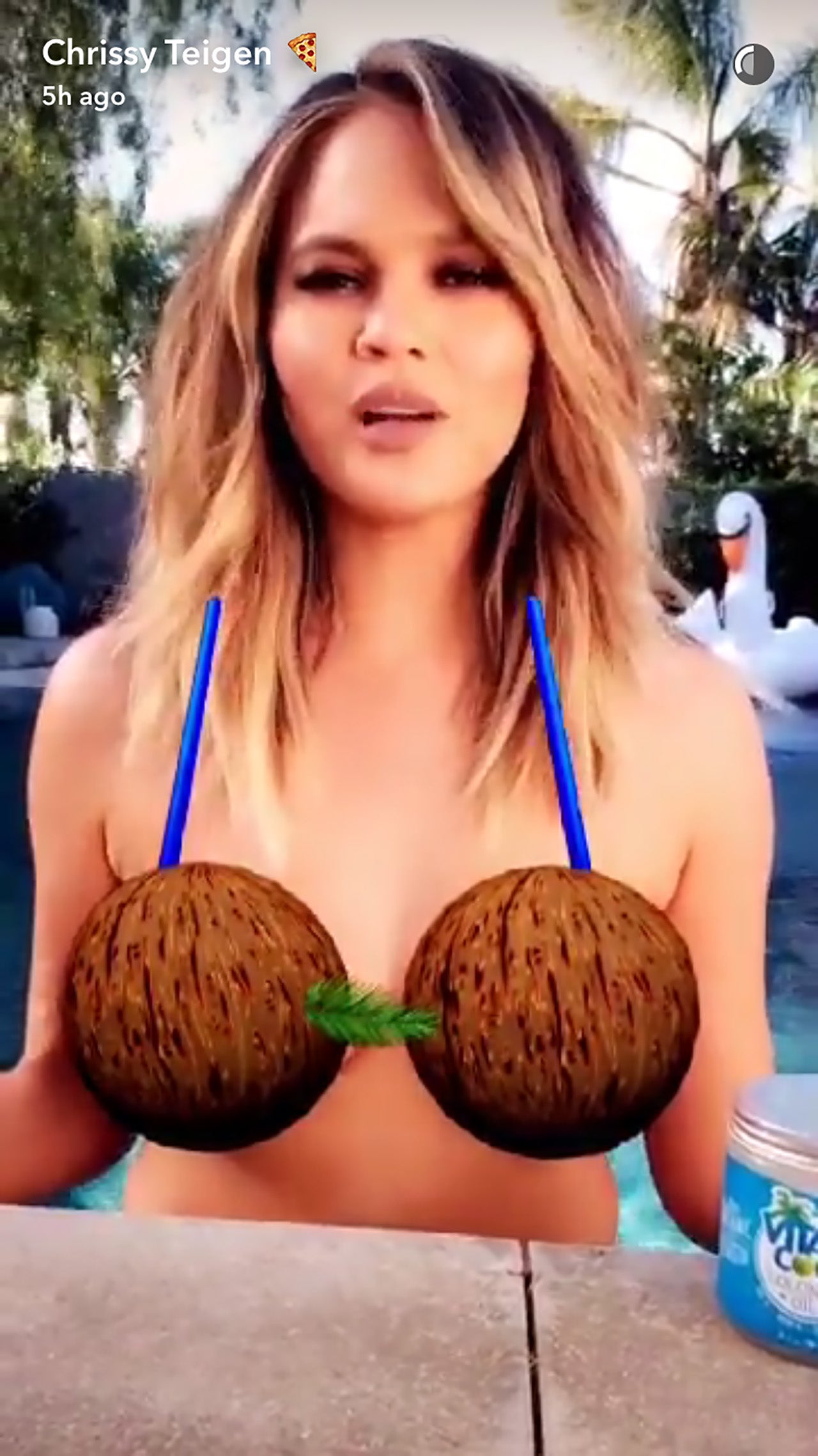 Who needs a shirt when there are coconut emojis?! Chrissy Teigen had some fun while endorsing Vita Coco coconut oil on Wednesday. The supermodel took to Snapchat to promote the new product in a series of comical clips.