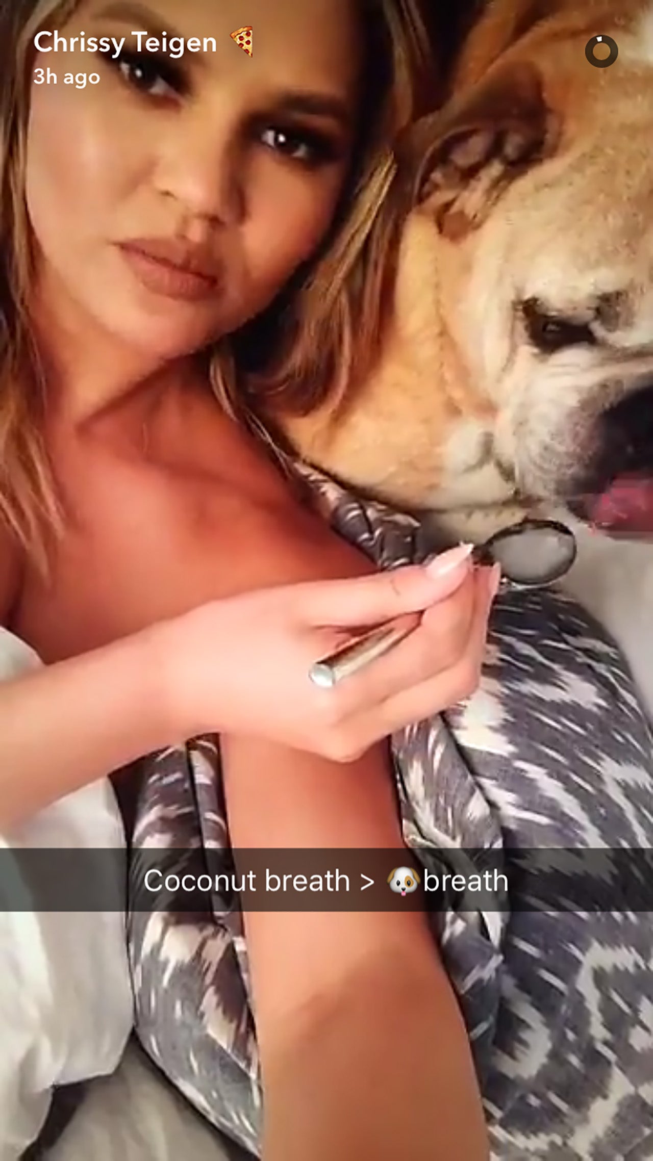 The product does apparently have one good use for the mouth though. Teigen let her dog lick some, saying, “Coconut breath > dog breath.”