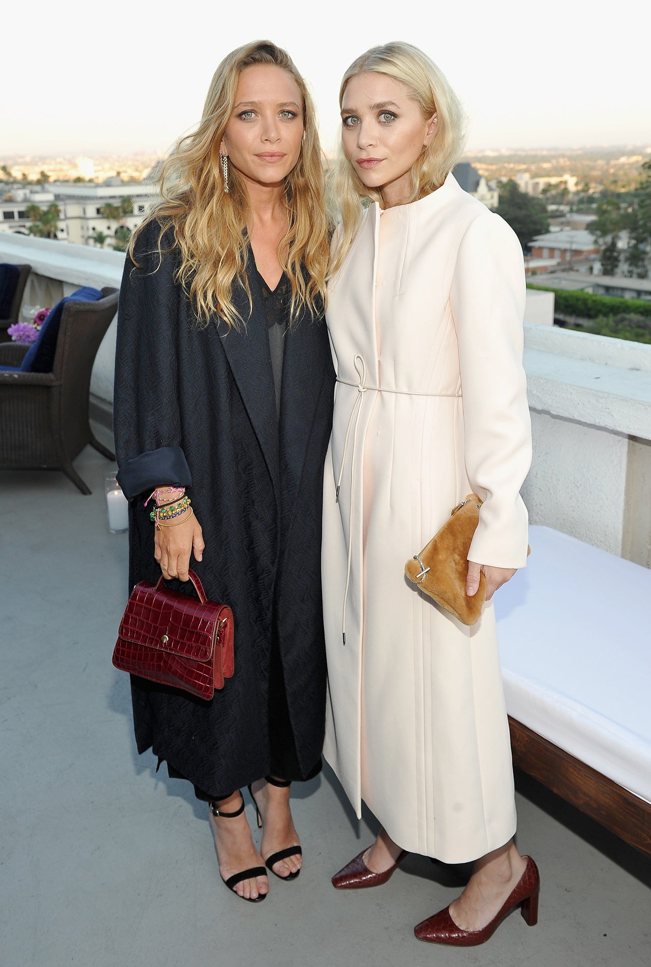 The 30-year-old twins looked chic as usual in near opposite ensembles -- Mary-Kate was sunkissed in all-black, while an icy blonde Ashley opted for a rose trench coat. The accessories are peak Olsen.