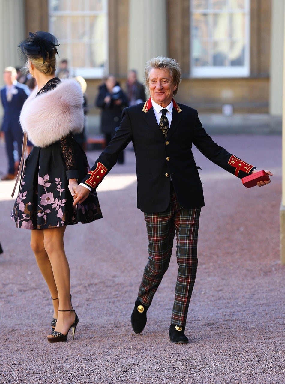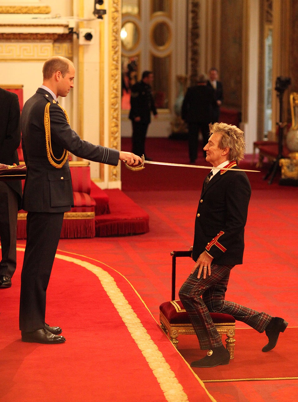 The 71-year-old singer was knighted by Prince William on Tuesday at Buckingham Palace in recognition of his services to music and charity, and couldn't look happier to receive the honor. Dressed in tartan trousers and a black coat, Stewart knelt as Prince William held a sword over his left shoulder.