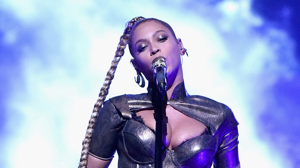 The "Formation" singer nailed the outfit -- as if there was any doubt -- donning a black bob wig, shiny red spandex body suit, gold high tops, a Casio watch and a chunky leather jacket exactly like the ones Salt, Pepa and DJ Spinderella wore in the original video.