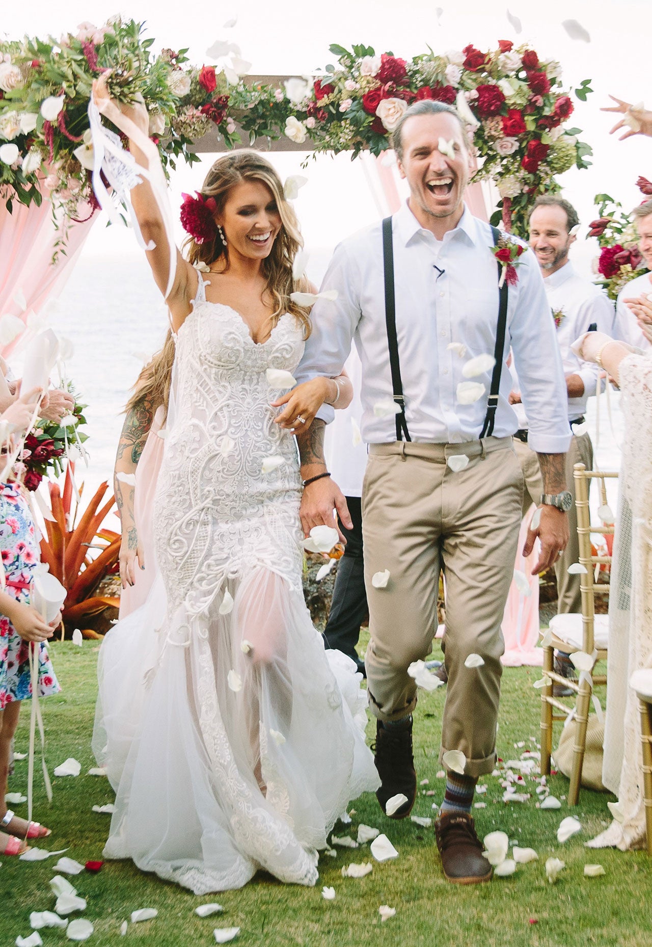 When Patridge exchanged vows with love Corey Bohan in a picturesque, beachside Hawaiian ceremony on Nov. 5 -- which she described as"magical" -- her Pallas Couture gown perfectly fit the pair's low-key, hippie-adjacent aesthetic. Her custom-made spaghetti strap dress, created in Australia, featured lace detailing along the bodice, which seamlessly flowed into the delicate train.