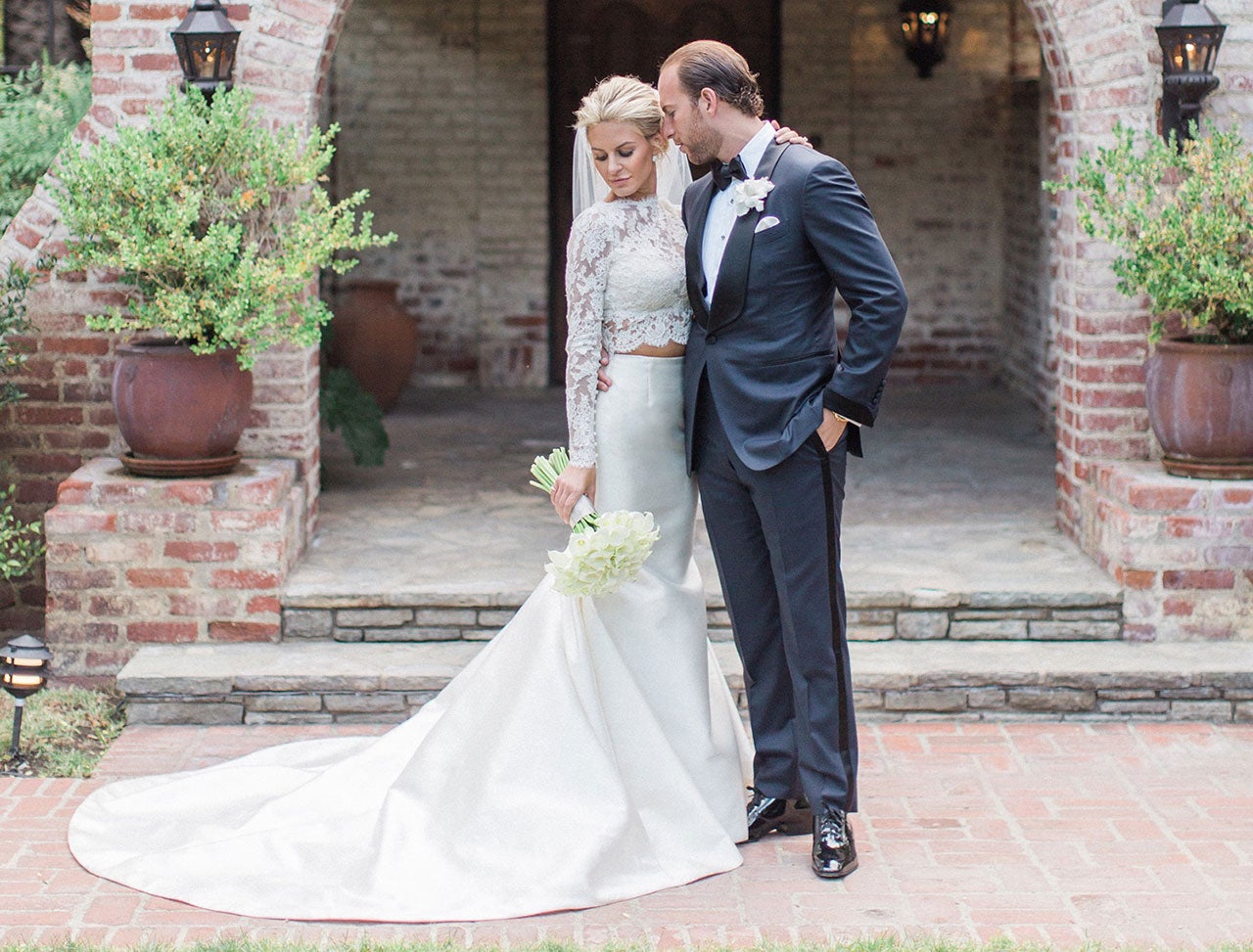 The two-piece dress Stewart wore when she wed boyfriend of nine years Brendan Fitzpatrick in Santa Susana, California, on May 7 was a showstopper -- and an accident! The Rich Kids of Beverly Hills star described the Badgley Mischka lace top and silk skirt combo as a "wedding outfit," telling PeopleStyle she found it just as she was about to give up the search for her perfect dress.