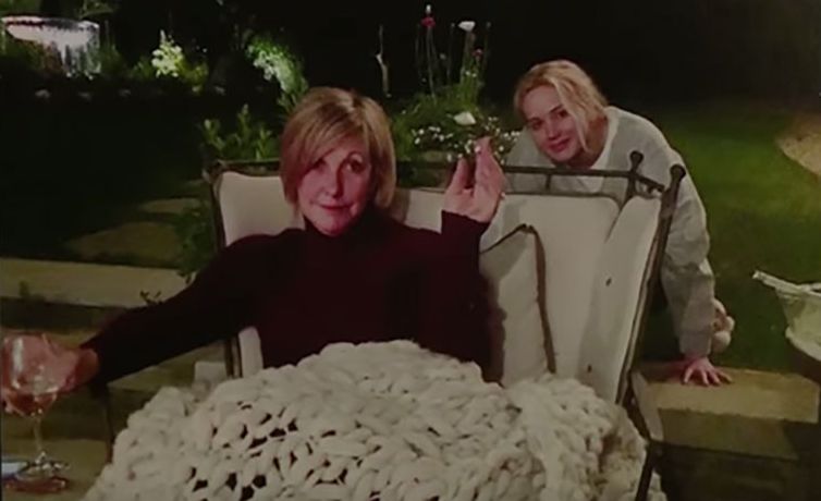In the snap, Lawrence's mom is sitting in a chair, innocently cuddled up with a white blanket and a glass of wine in her hand as the sneaky Oscar winner stood behind her, flashing a smirk.