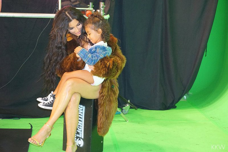 The reality star shared behind-the-scenes pics from her lingerie-filled Love magazine online advent calendar shoot via her website, that show Kim and husband Kanye West's 3-year-old daughter hanging out on set with her mom between takes.