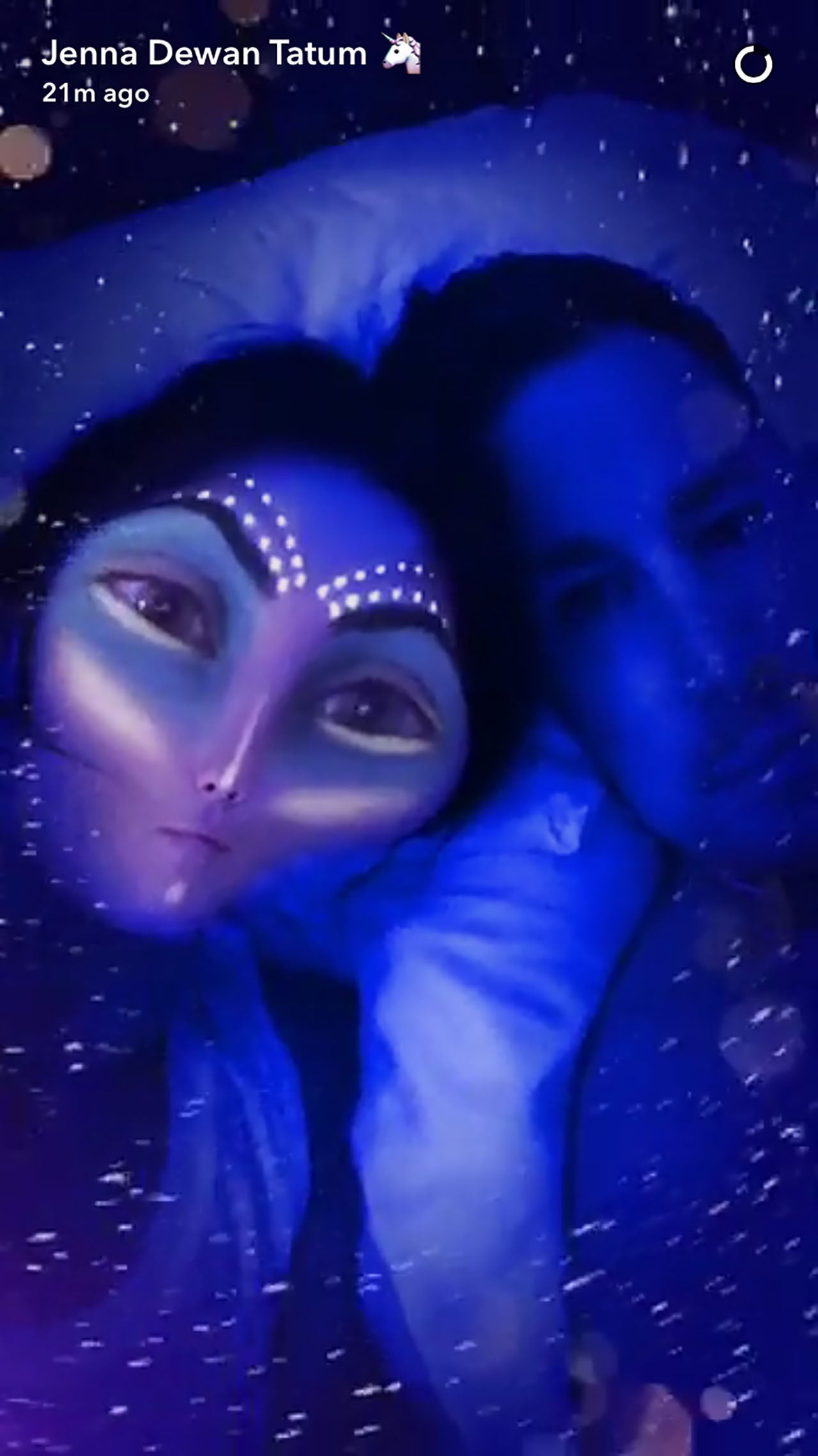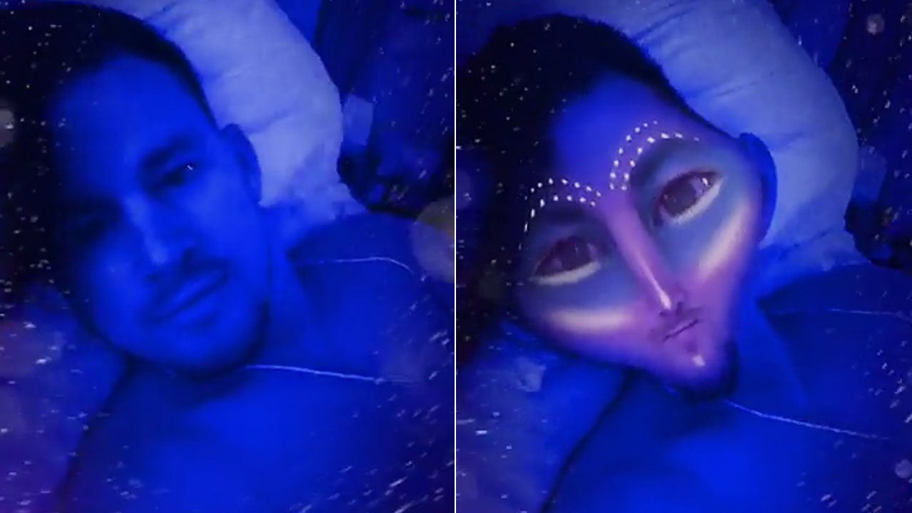 Using the purple alien filter, Jenna goofed off with Channing under the covers.