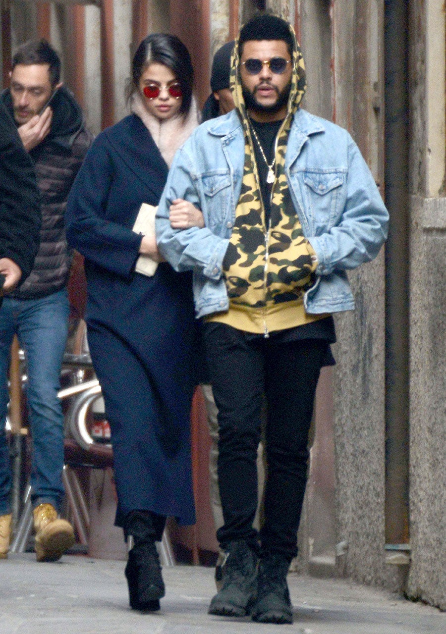 The couple was spotted walking arm-in-arm in Venice on Monday before taking a boat ride, still on their romantic vacation. Gomez bundled up in a navy blue coat and scarf as she hung on to a casually dressed The Weeknd, who sported black jeans, a yellow camouflage hoodie and a denim jacket.