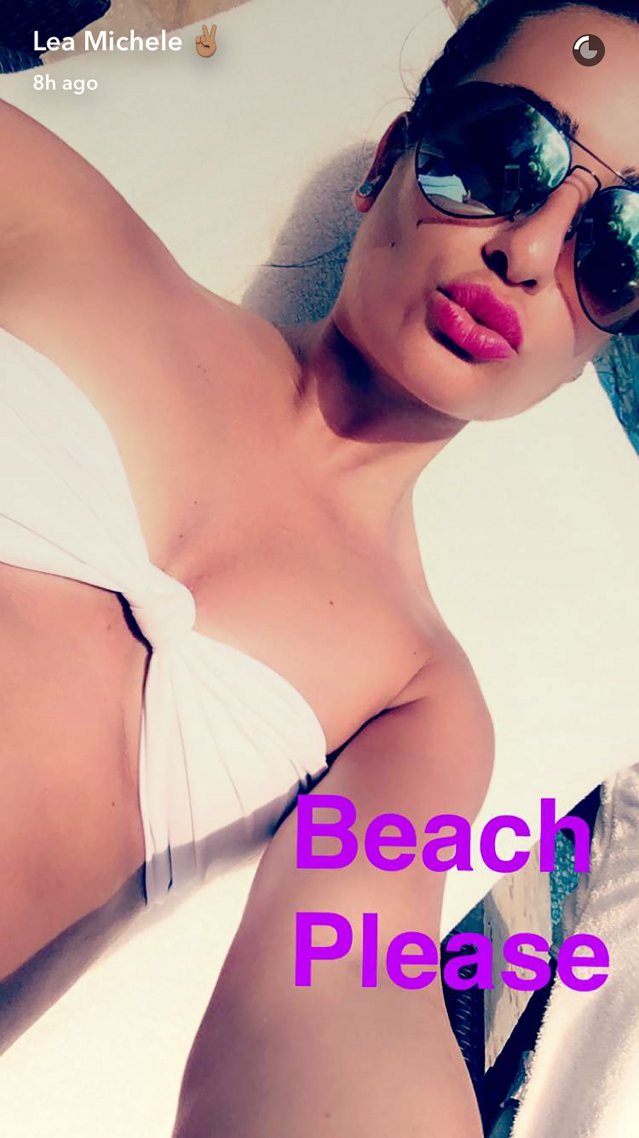 The Glee alum rocked a cream bandeau bikini top in several Snapchat selfies, sipping on a coconut and getting ready for “Beach time.”